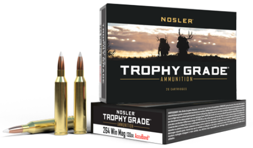 Nosler Trophy Grade ammunition is loaded with Nosler AccuBond bullets. The AccuBond®’s unique white polymer tip assures accuracy and smooth chambering, while the boat-tail base at the rear of the bullet acts as a platform for large diameter mushrooms. Designed for accuracy near or far, Nosler’s Trophy Grade ammunition provides undeniable reliability.