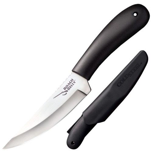 Historically, the Roach-Bellied knife was a short blade with a pronounced upswept curve and a sharp point that saw popularity in 17th century Britain and the American Colonies. It was most likely named after the common Roach Fish, which had a similarly round curving belly. Cold Steels model is a nod to the Black Powder Community, which has continued to appreciate the Roach Bellys economy, versatility and effectiveness. The hollow ground blade is made of sub-zero quenched German 4116 Stainless steel, expertly heat treated to RC 56-57, and given a sharp edge thats easy to maintain. Instead of the traditional wood handle, ours is made of a tough injection molded polymer, making the Roach Belly considerably more weatherproof than historical examples - not swelling, shrinking, rotting or cracking like its wooden counterparts. The Roach Belly comes complete with a durable polymer sheath, making it a breeze to carry all day or on extended hunting or camping adventures.