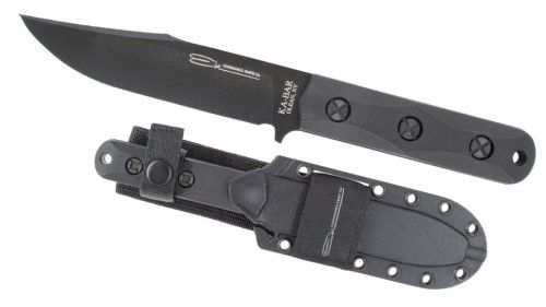 KA-BAR is excited to introduce the much anticipated John Ek Commando Knife Co. product, the Ek Model 50. This updated version of the occupational fighting knife is made from 1095 Cro-Van steel and features a black finished clip point blade measuring in at 5.06 inch in length. The textured Ultramid handles have four bevels that provide extra grip and are attached with traditional X-head fasteners and it has a small guard to prevent you from sliding forward onto the blade. The US-made Celcon sheath is a friction fit design with MOLLE compatibility and a belt loop. Every component of this knife is proudly made in the USA and this is both a great knife and a great value. Specifications: